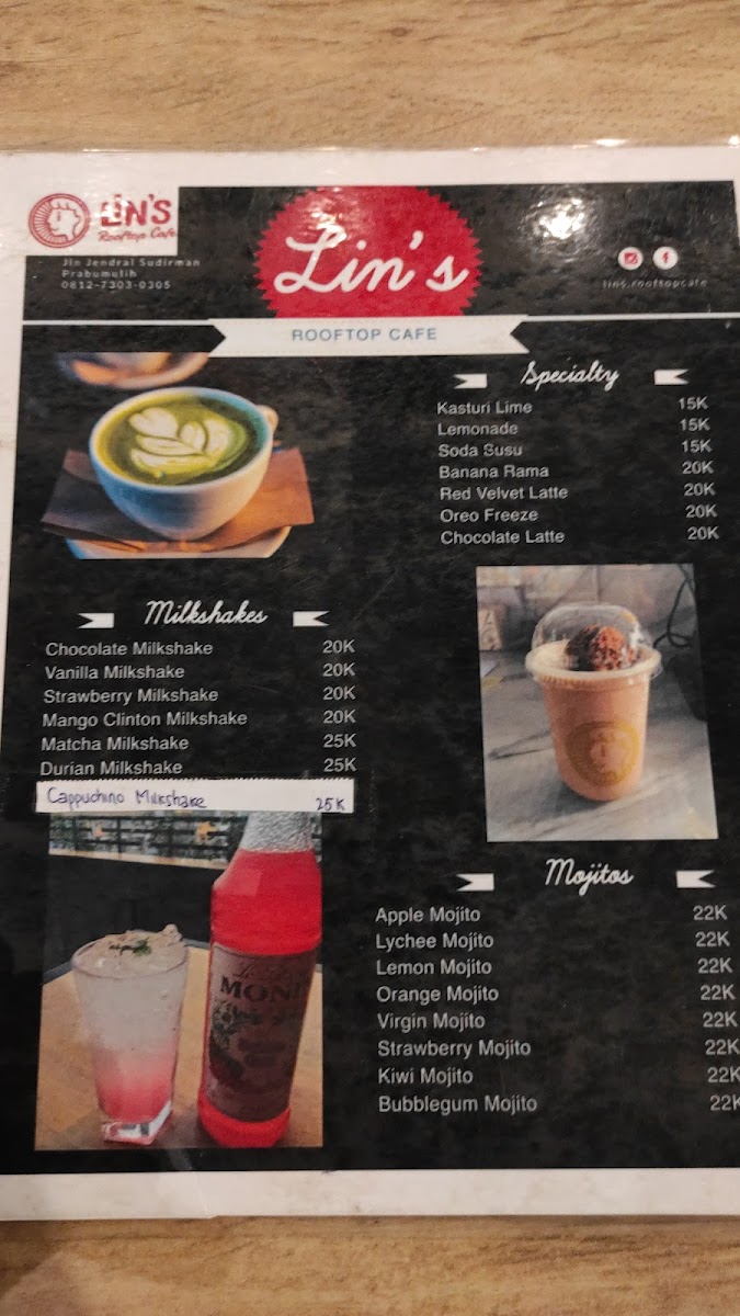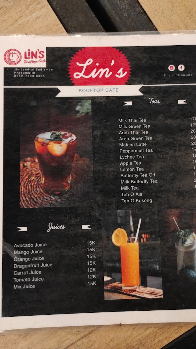 Welcome to Lin's Rooftop Cafe, a hidden gem perched on the third floor at Jl. Jenderal Sudirman No.001, Prabumulih. This cafe not only offers a stunning view of the bustling streets below but also a delightful menu to savor. From the moment you step in, you can soak in the lively atmosphere, enhanced by occasional live music, making it a perfect spot for hanging out with friends or family.
